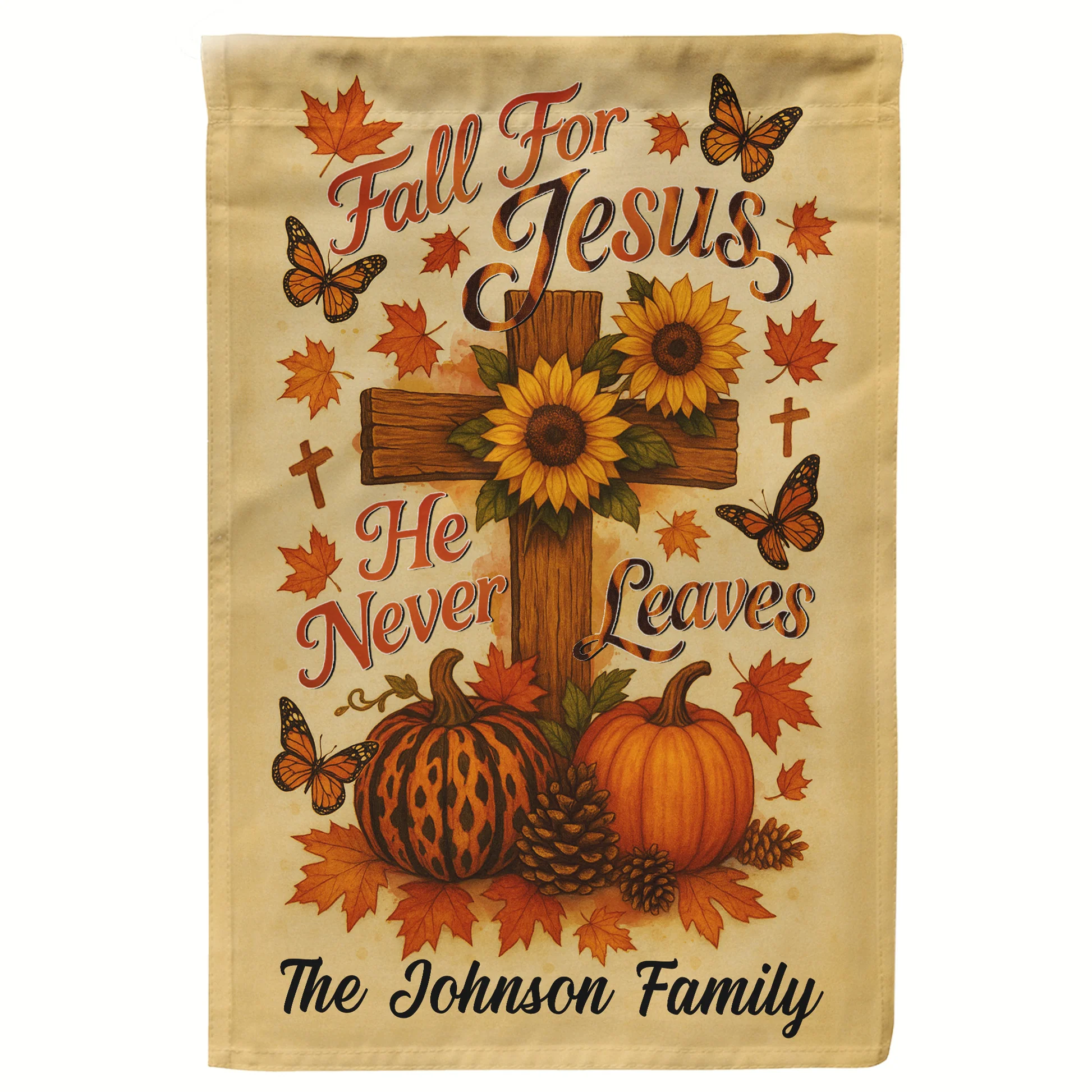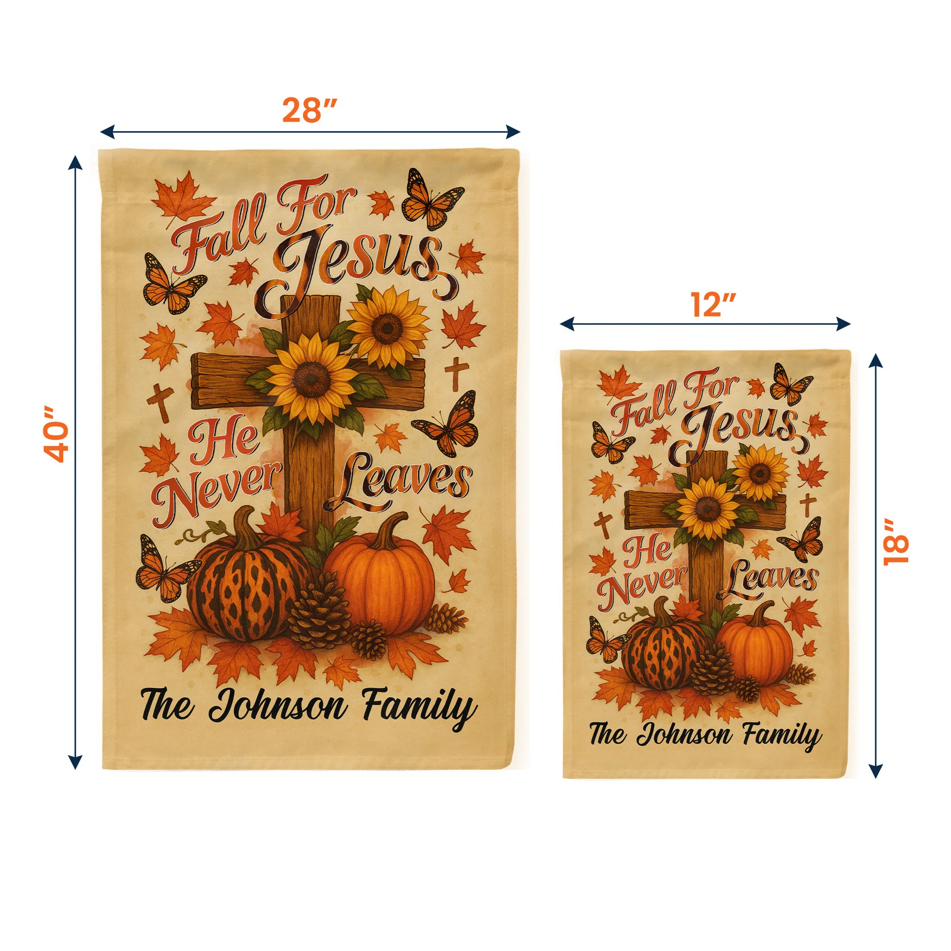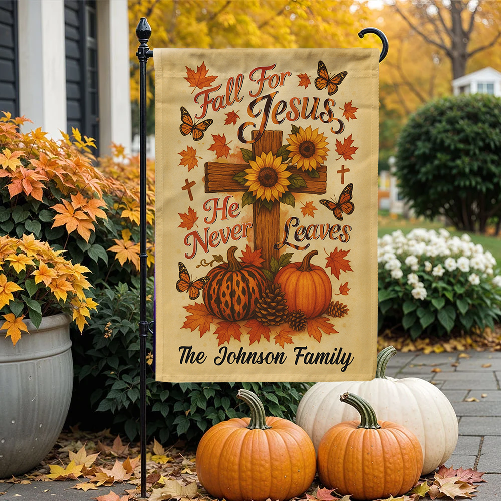 Personalized Fall For Jesus He Never Leaves Custom Family Name Garden Flag