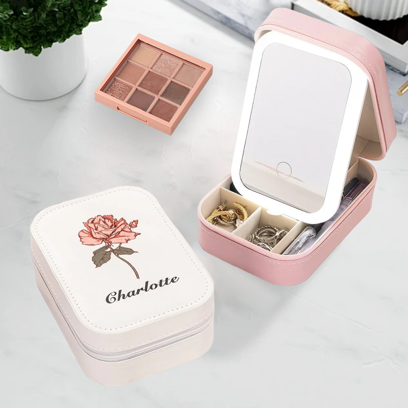 Personalized Birth Flower Travel Leather Jewelry Box with LED Makeup Mirror – Custom Name & Adjustable 3-Color Light – Ideal Birthday Gift For Her
