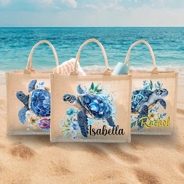 Bring a touch of ocean charm wherever you go with this beautiful and eco-friendly Personalized Floral Sea Turtle Jute Tote Bag. Perfect for beach days, casual outings, or just running errands, this sturdy tote features a unique, handpicked sea turtle design adorned with vibrant floral patterns. Whether you're a sea life enthusiast or love nature-inspired accessories, this bag is sure to capture attention and add a fun yet meaningful element to your style.