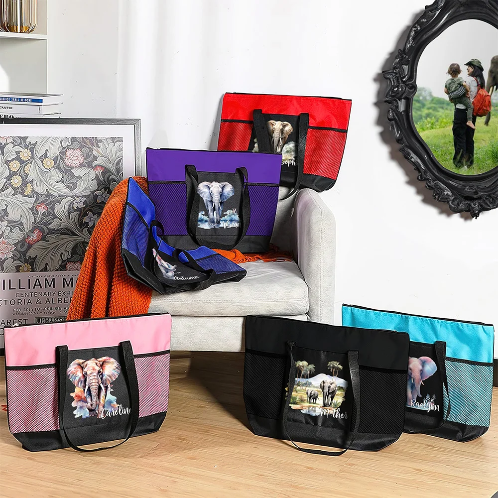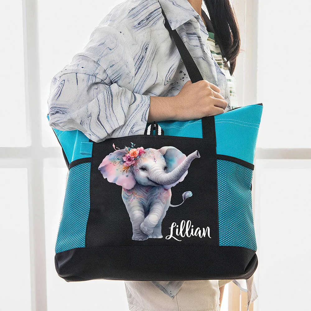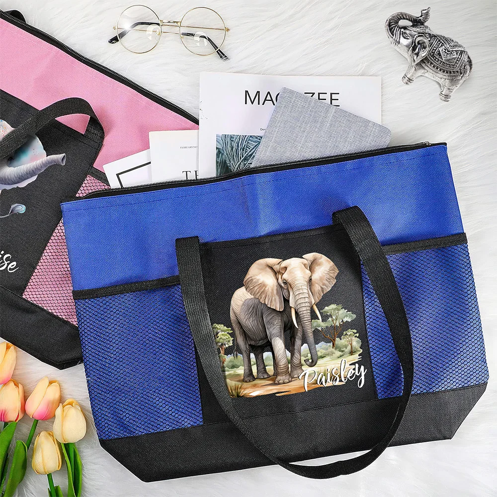Personalized Jungle & Watercolor Style Elephant Design Waterproof Mesh Tote Bag with Name